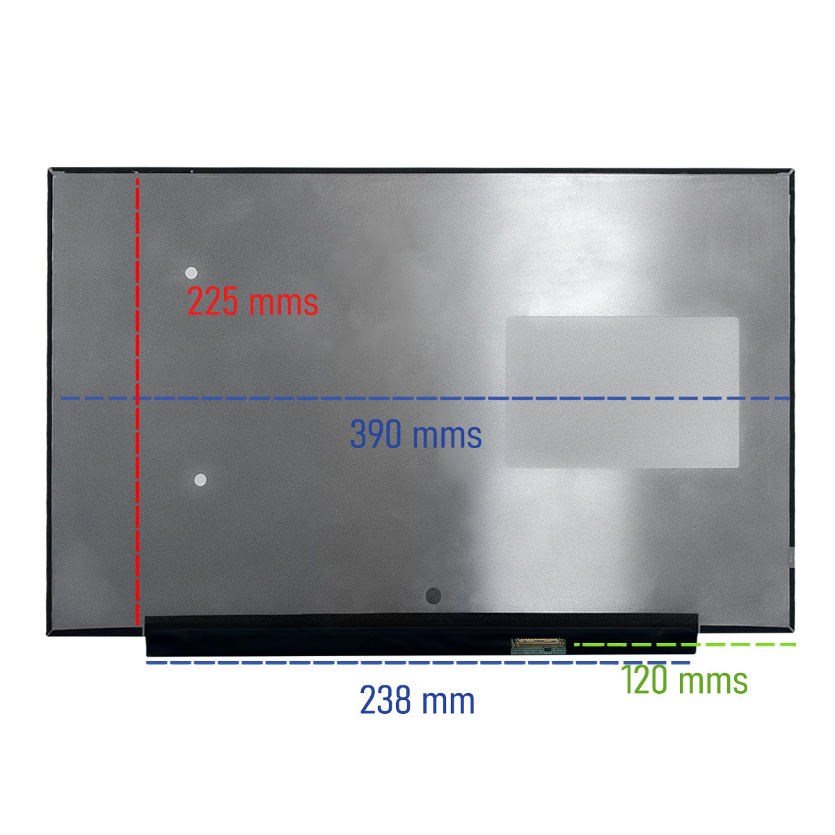 Les dimensions de l'ecran: 390(L)X238,01(H) X3,5(l) mm, la hauteur de l'ecran non inclus la barre 225mm, la taille de la barre: 238mm, la distance du connecteur: 120mm, caracteristiques: 240Hz sans fiXations non tactile